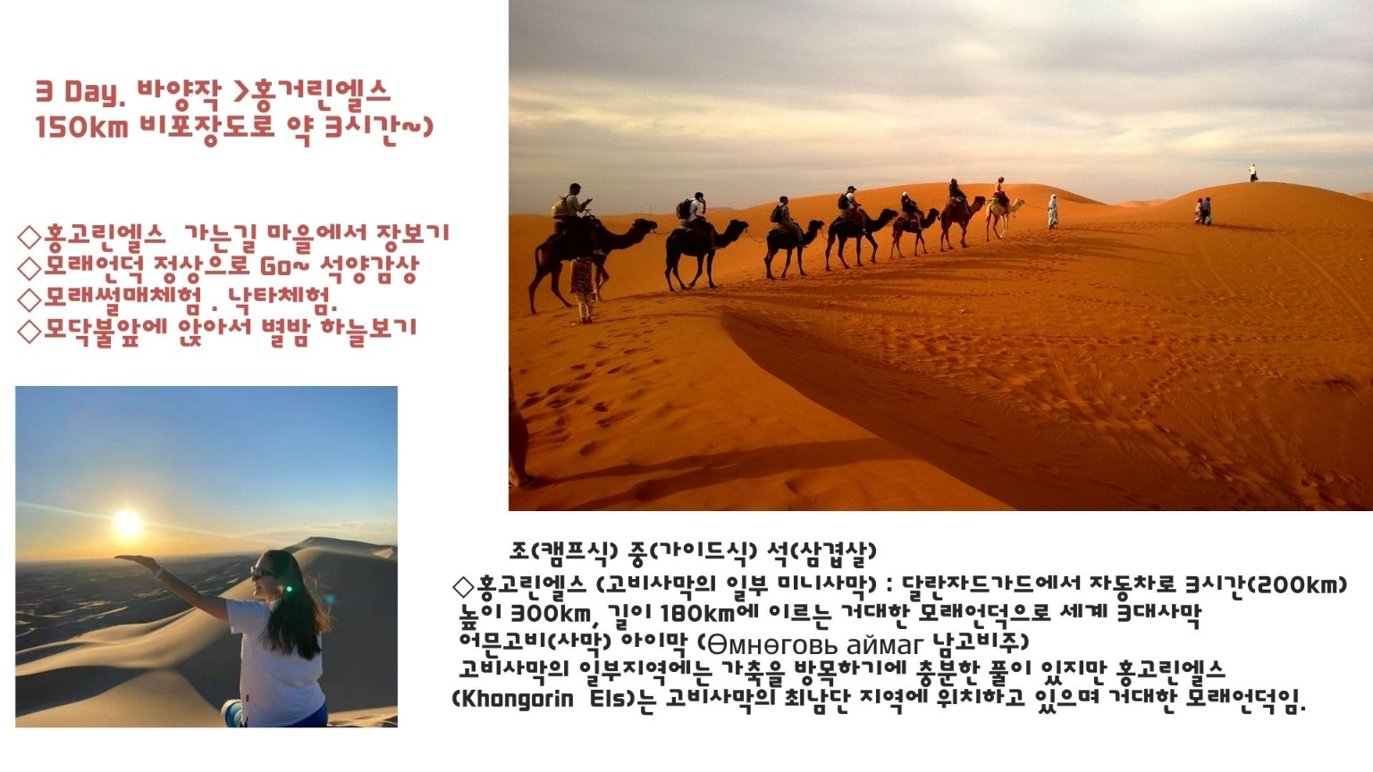 이번 답사여행은 젊은 20~30대 연령층이 많이 가는 여행지 고비사막에 50~60대 중년 연령층도 가능한 여행지인지
