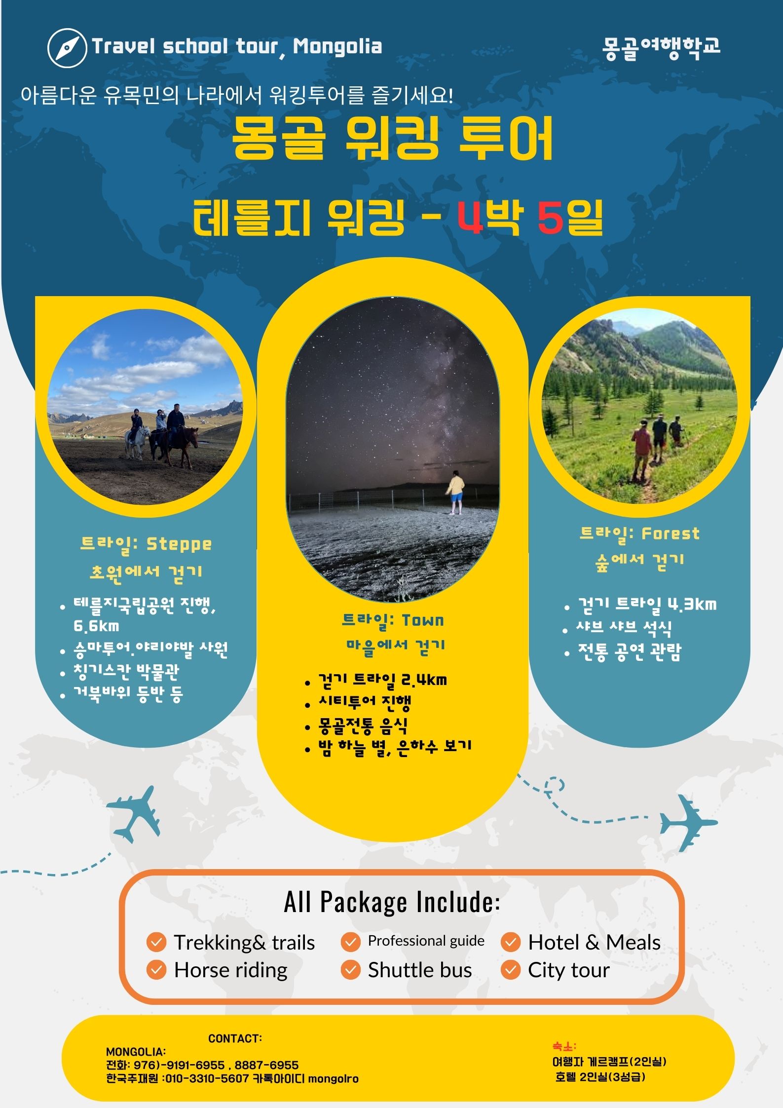 또, 걷기 뿐만이 아닌, 몽골 관광 및 체험, 관람 등도 포함 되어 있습니다..