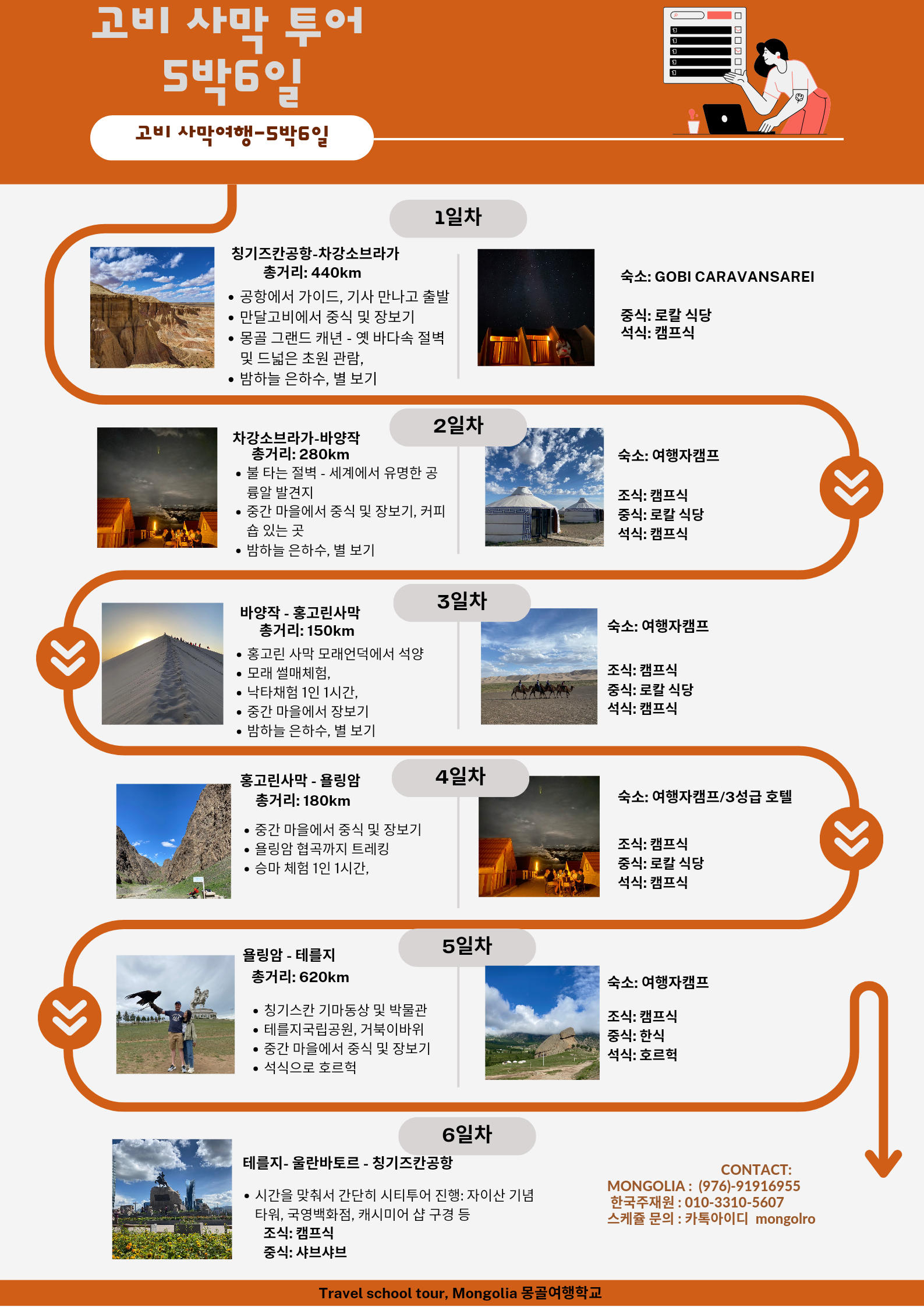 지친 일상에서 벗어나 몽골고비사막의 무한한 풍경과 모험으로 가득 찬 5박6일 여행에 참여해보세요.