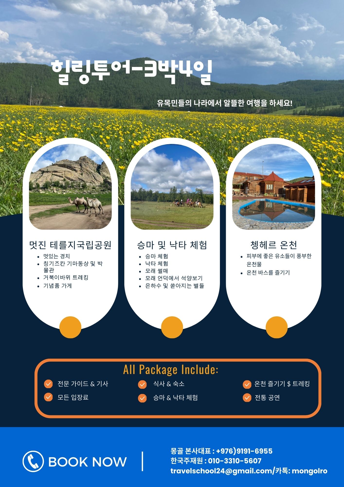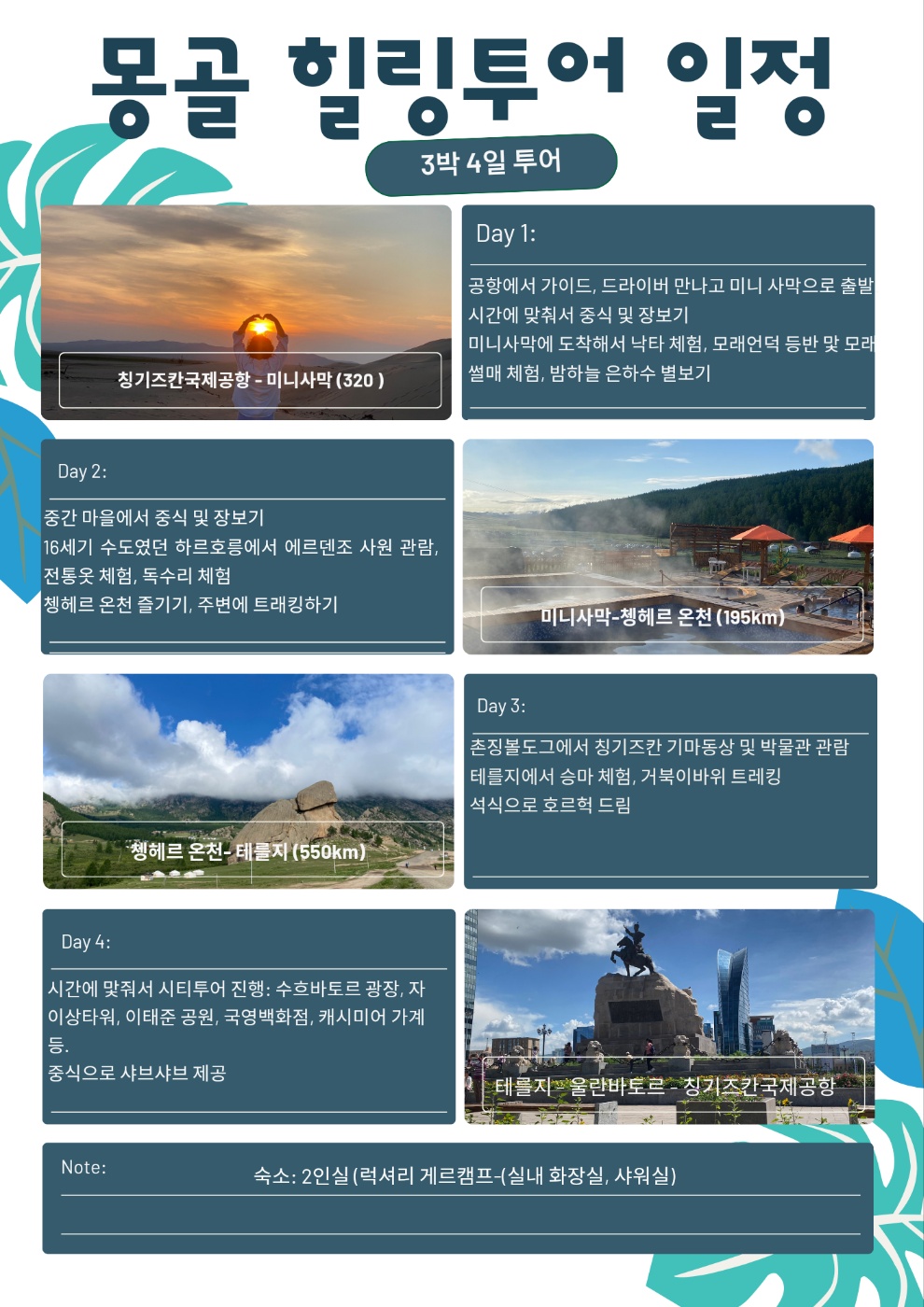 몽골 인기 여행지 남고비사막은 너무 멀고 여행기간이 길어서 미니사막과 노천온천 휴양지, 국립공원 테렐지 까지