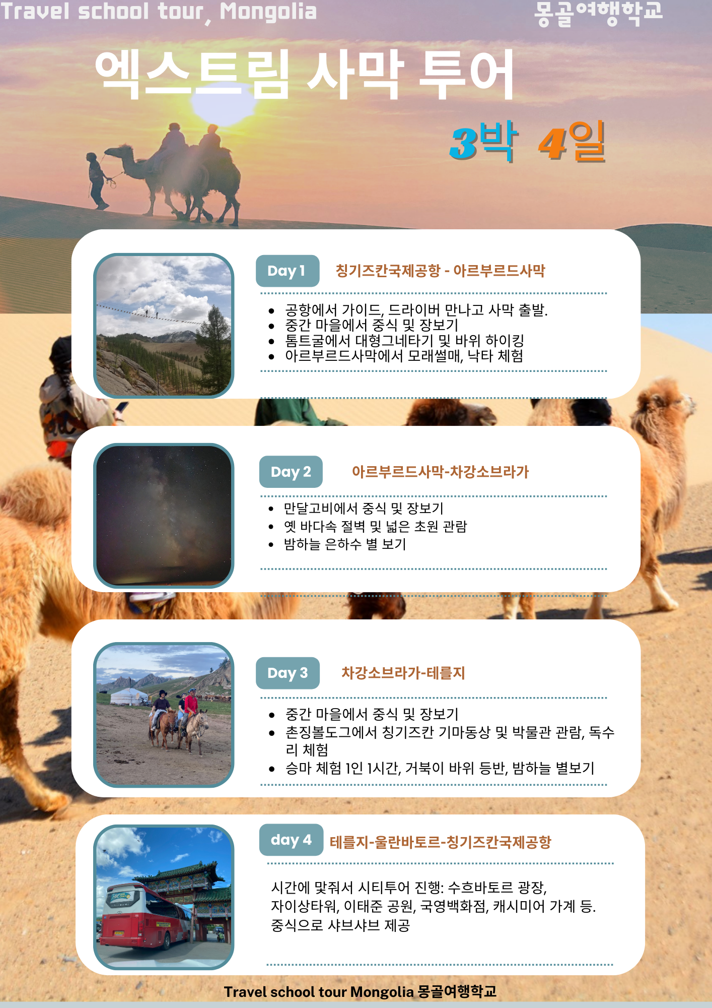몽골 징키즈칸 공항에서 가까운 미니사막인 아르부르드사막과 차강소브라가 -국립공원 테렐지-울란바타르까지 짧은 일정으로 몽골여행을 할 수 있는 알뜰 투어 프로그램입니다.