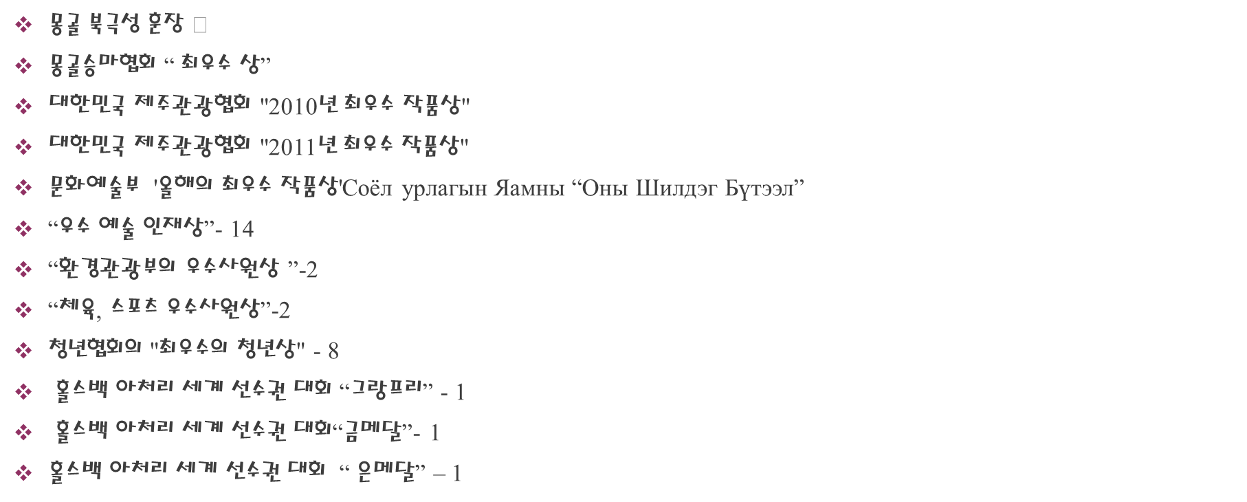 대한민국 제주도에서 몽골의 역사, 문화, 전통, 관습, 몽골인의 승마 기술을 각색된 승마 쇼 공연을 세계 최초로 교사 6명, 말 120마리, 인원 60명이 참여하여 '칭기스칸의 사나운 검은 깃발'라는 제목으로 작곡되어 2008년 11월 26일 또는 몽골 독립기념일부터 연출되기 시작했습니다. 대한민국 제주도 승마공원에서 2008 – 2011년까지 본 공연으로 총 5백만 명의 관광객 대상으로 관람 시키고 몽골 전통 문화를 널리 홍보 역할을 하였습니다.